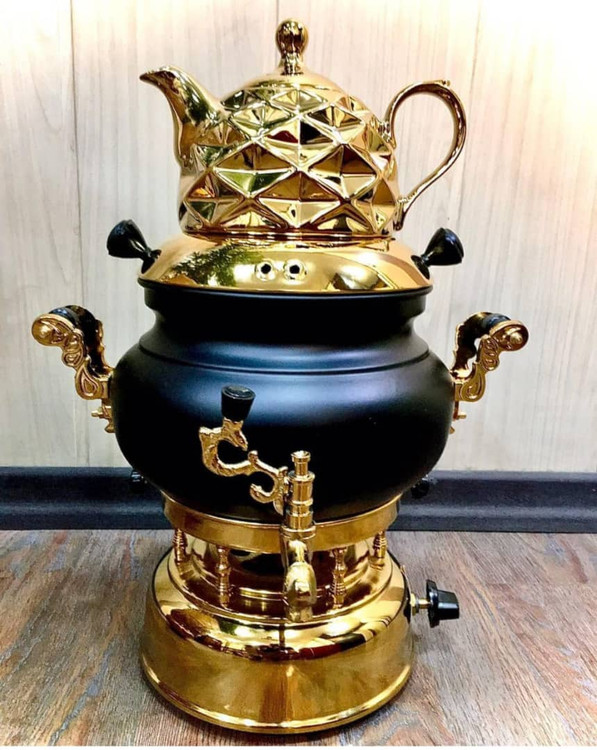 سماور به رنگ مشکی و قوری به رنگ طلایی