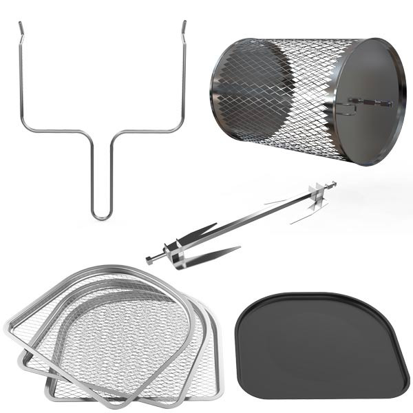 قطعات همراه دستگاه : توری سرخ کن گردان – جوجه گردان – سینی روغن گیر – سه عدد توری